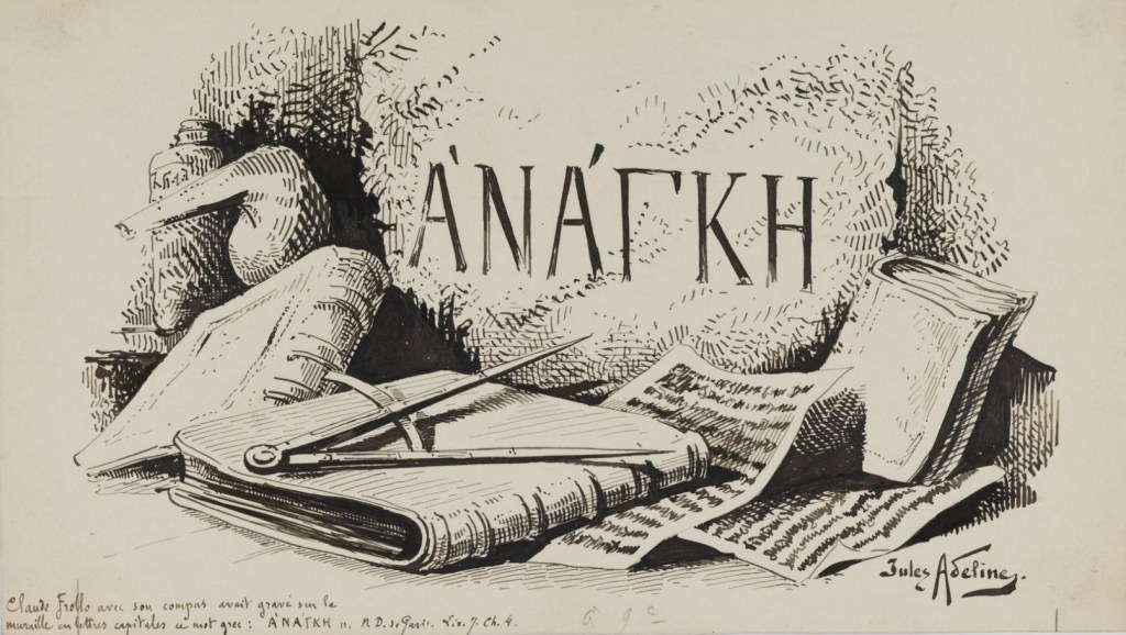 “È su quella parola che è stato scritto questo libro.” Così Hugo conclude la sua prefazione: quasi un riscatto, un’elegia, l’unica testimonianza diretta di un’antica incisione anonima sui muri della cattedrale, incisione inesorabilmente cancellata (scrostata o intonacata) insieme al suo anonimo autore. Ανάγκη, “anànche”, ovvero fato, morte, predestinazione: il decadimento naturale di tutte le cose, senza eccezioni. Ironicamente destinata allo stesso oblio che descrive, questa fatalità è ciò a cui nessun uomo non può sottrarsi, per quanto potere, controllo e ordine ottenga: è la consapevolezza che, qualsiasi posizione o rango sociale egli ricopra, l’unica cosa certa è che un giorno morirà. Non è un caso, allora, che Hugo attribuisca l’autorialità della macabra incisione al tormentato Dom Claude Frollo. Come del resto anche Quasimodo per l’aspetto e la Esmeralda per l’etnia, Frollo è un emarginato del suo tempo: ma nel suo caso, il motivo del suo isolamento è più complesso e sfaccettato rispetto agli altri personaggi. Innanzitutto, in quanto arcidiacono di Notre-Dame, egli gode di un prestigio sociale piuttosto elevato, accentuato dalla posizione di favore che ricopre nei confronti del sovrano di Francia Luigi XI; viene descritto come uomo pio e retto, devoto alla fede cattolica quanto all’accrescimento intellettuale, e premuroso verso il fratello Jehan, da lui cresciuto come una madre e fonte di costanti delusioni. Proprio quest’indole caritatevole lo porta ad adottare un bambino deforme abbandonato davanti alla cattedrale, richiamato da una folla di persone riunitasi ad osservare “il figlio del demonio”: a lui darà il nome di Quasimodo, dal nome della seconda domenica di Pasqua, giorno in cui è stato abbandonato, detta domenica quasimodo (dall’incipit dell’introito della messa: “quasi modo geniti infantes”, ovvero “come bambini appena nati”). Questa sua opera di carità malvista dal resto del popolo (che vede Quasimodo come figlio di una strega o incarnazione del male) rinsalda la sua nomea di mago e stregone, conferitagli principalmente dai suoi studi e pratiche di alchimia, pseudo-scienza in cui la sua sete di conoscenza e controllo è necessariamente approdata dopo aver perlustrato lo scibile umano (nomea coadiuvata anche dalla clausura volontaria e una paura delle donne che rasenta la misoginia). Proprio l’alchimia è un’interessante aspetto del personaggio, in quanto “scienza” che cerca di emulare la creazione divina, trasformando ad esempio la luce in oro: una scienza che cerca di regolamentare la religione e la fede. Questa ricerca di un controllo empirico è in netto contrasto con la vocazione di Frollo, che attraverso l’alchimia cerca di farsi Dio, averne le facoltà; proprio l’ossimoro sembra essere la vera natura del personaggio, moralmente ammirabile sotto certi aspetti, ma corrotto fino al punto di non ritorno man mano che la storia prende piede, che s’infatua della Esmeralda pur disprezzando le donne e gli zingari, che salva Quasimodo da morte certa, ma sembra trattarlo più come uno strumento per la salvezza del fratello, che un vero essere umano. E infine, in piena opposizione con il libero arbitrio professato dalla chiesa, Claude Frollo incide nella sua stanza della torre di Notre-Dame la parola greca della prefazione, parola che non vede salvezza né crede nella libera scelta; un degrado inesorabile e inarrestabile.